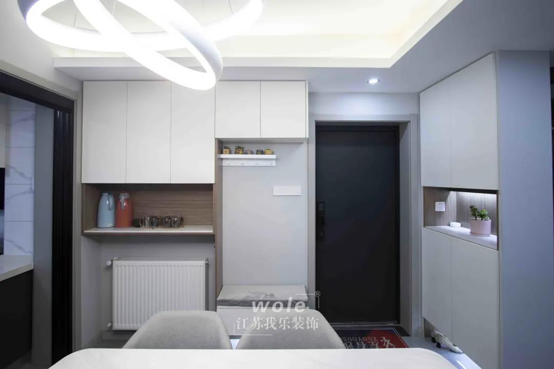 在玄關(guān)的規(guī)劃上,右側(cè)設(shè)置了一個鞋柜,中間開放式區(qū)域用于放置鑰匙等常用物件,柜體的下面留出了15公分左右的空間放置常換的鞋子,并輔以燈帶照明。左側(cè)定做了一個穿鞋凳,左右換鞋凳柜與鞋柜的設(shè)計更加方便!