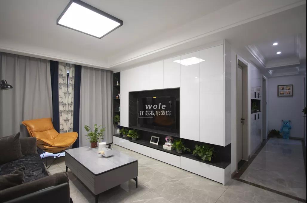客廳的設(shè)計以黑白灰為主,白色的背景墻搭配灰色沙發(fā),彰顯出現(xiàn)代風(fēng)的簡潔、干練。背景墻上以婚紗照作為點綴,幸福又溫馨。櫥柜式的電視背景墻,增加了日常的收藏儲物功能。內(nèi)嵌式的電視機,增加了空間使用感,設(shè)計的實用又美觀!黃色的躺椅為簡單素雅的空間添加了跳躍的元素,給予視覺上的美感!