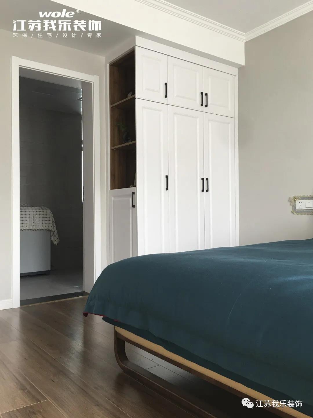 半墻的柜體充分滿足日常儲物,大大小小的物品都藏進(jìn)柜體,分類收納,保持臥室的整潔清爽。柜門上黑色把手的設(shè)計(jì),起到點(diǎn)綴的效果。
