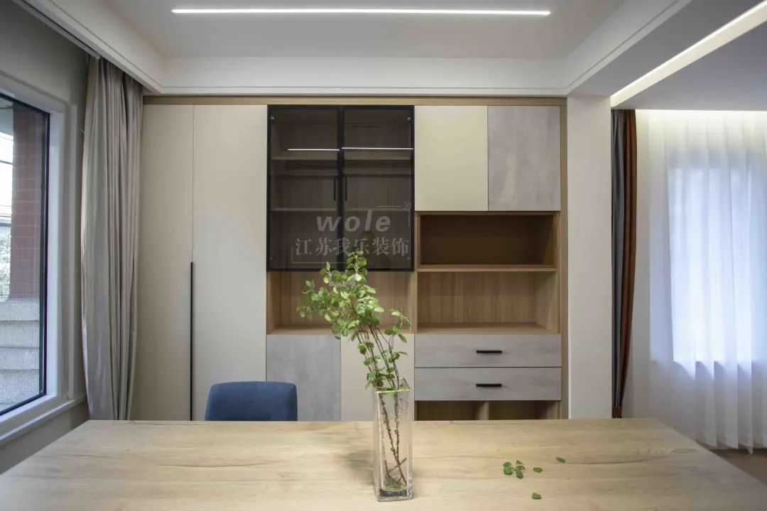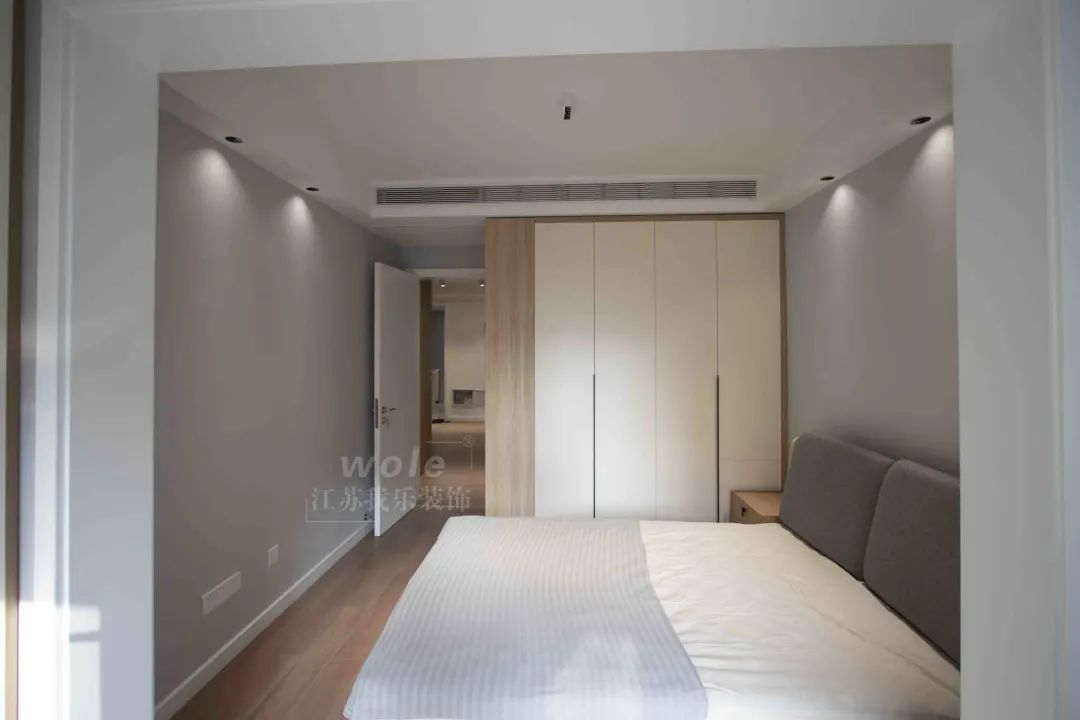 灰色背景墻搭配木色和白色的衣柜,主觀視覺上給人以一種平靜、簡潔大方的感覺,全屋的無主燈設(shè)計,使得臥室的氛圍感更加強烈。