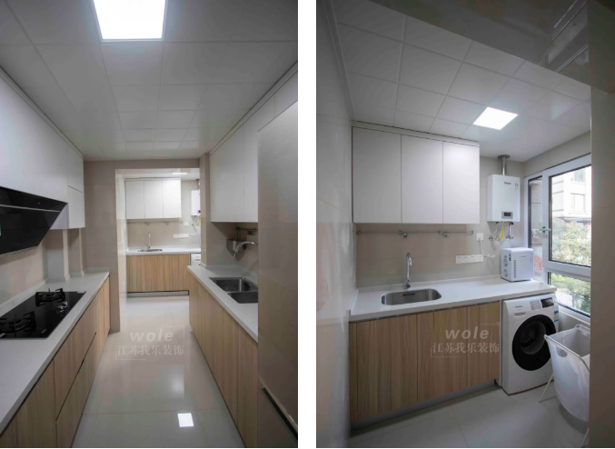 廚房布局一分為二,原木色的櫥柜和白色灶臺的搭配,簡潔大方,廚房的盡頭配有洗衣房,洗衣機、洗手池一應(yīng)俱全,科學合理的利用了空間。