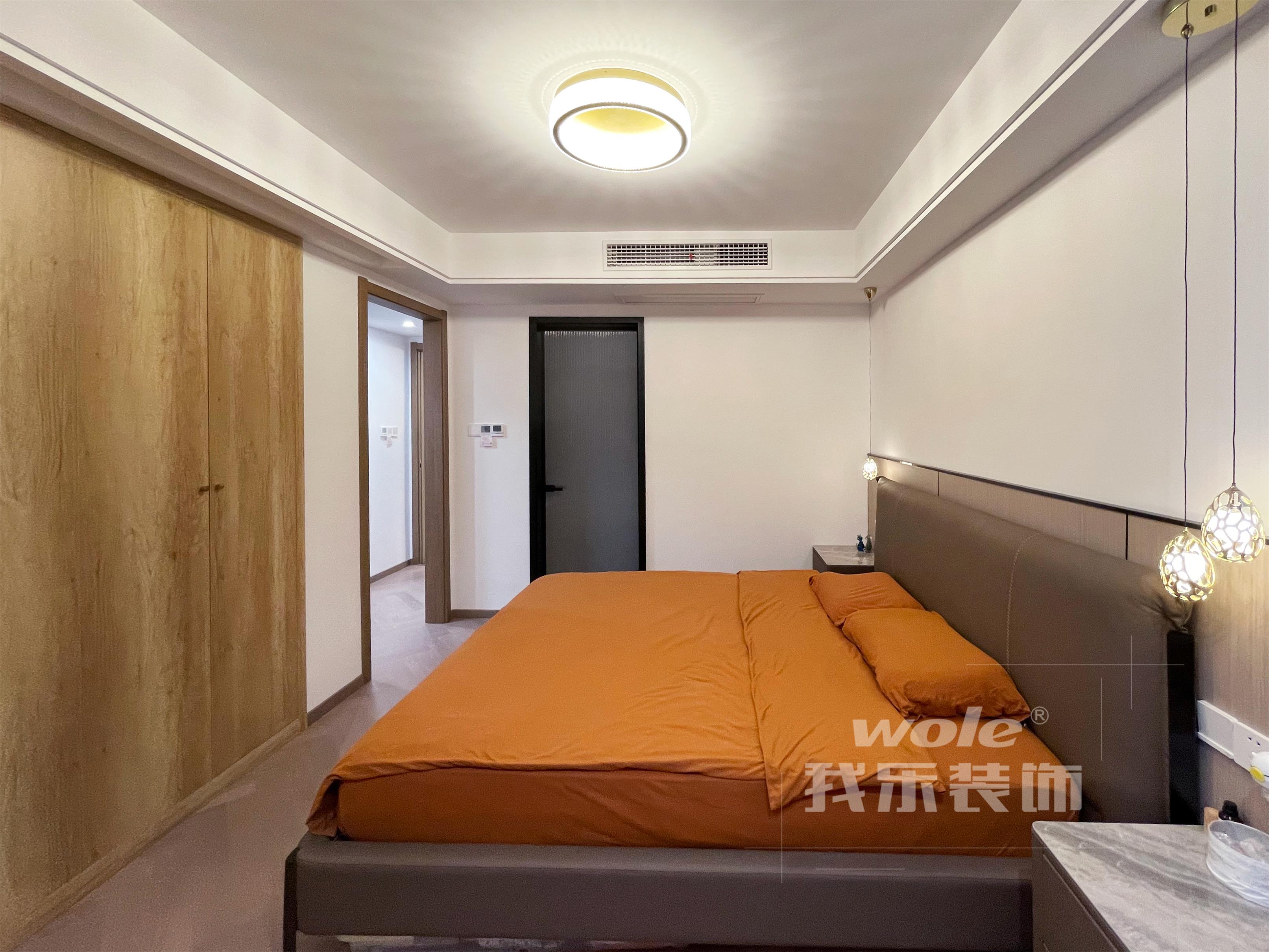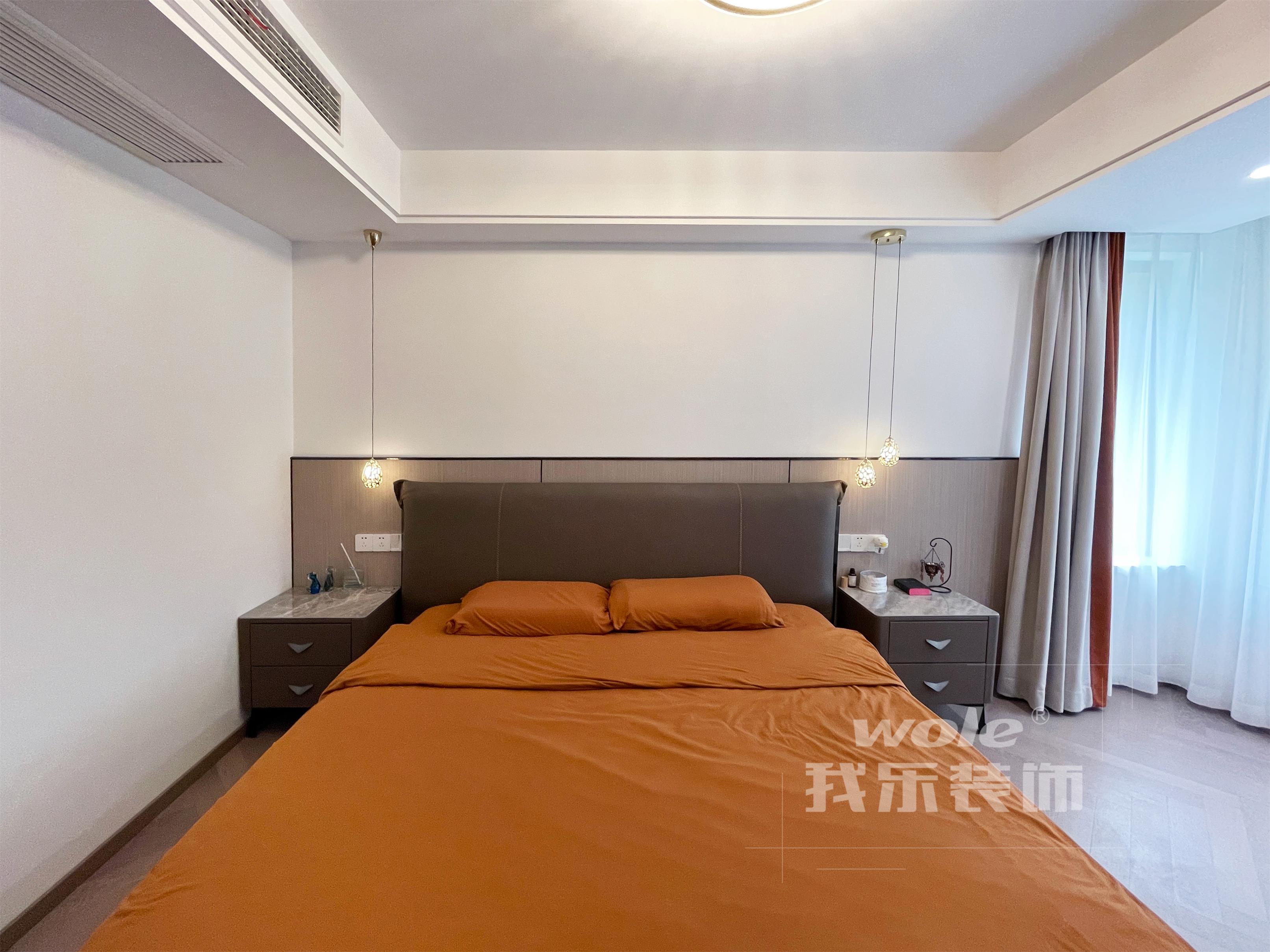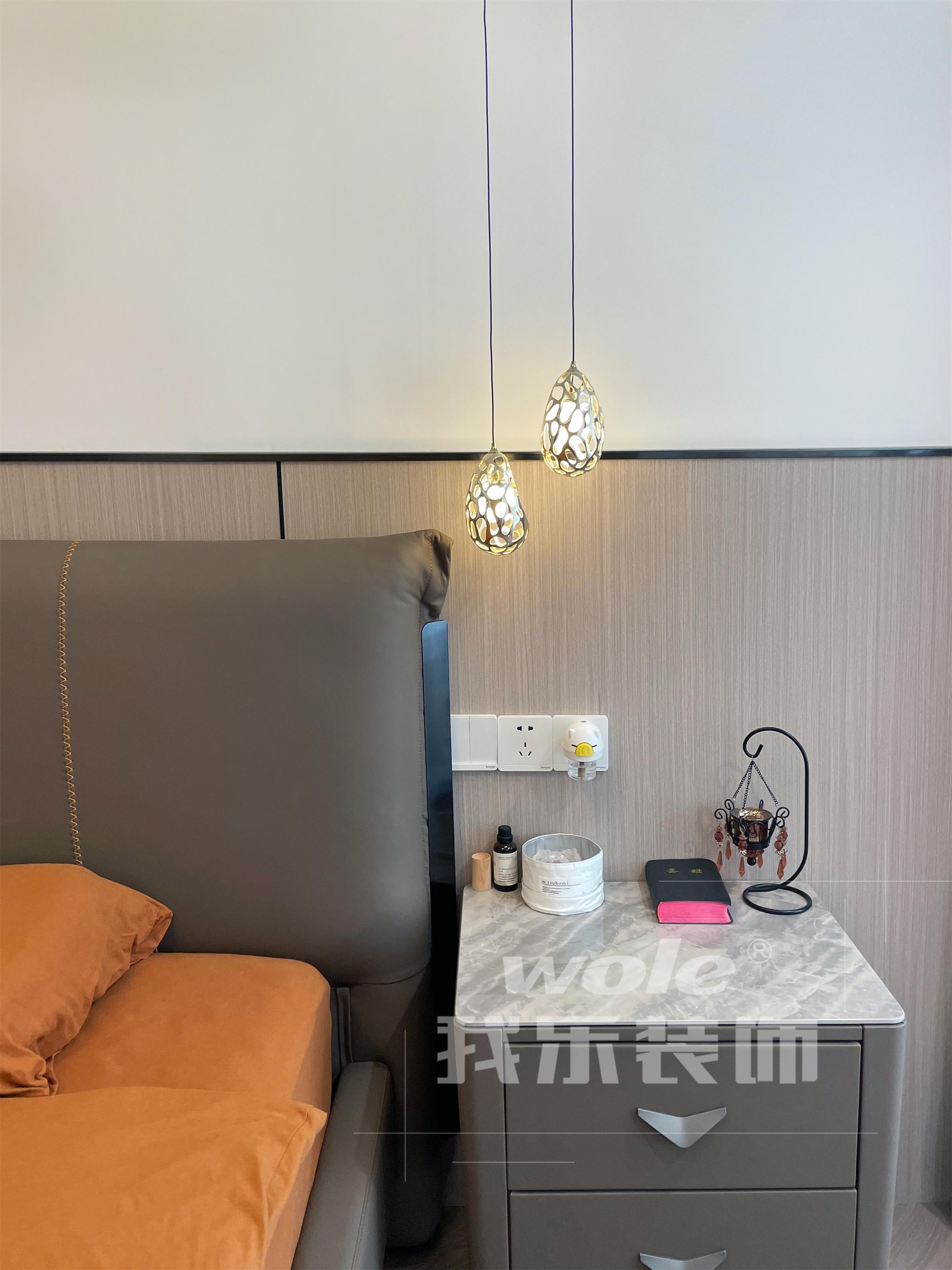 床上四件套與窗簾點(diǎn)綴、燈都是以橙色為主,床兩側(cè)垂著的吊燈,像燈籠般照亮人心,讓整個(gè)空間潔凈舒緩又精致隨性。