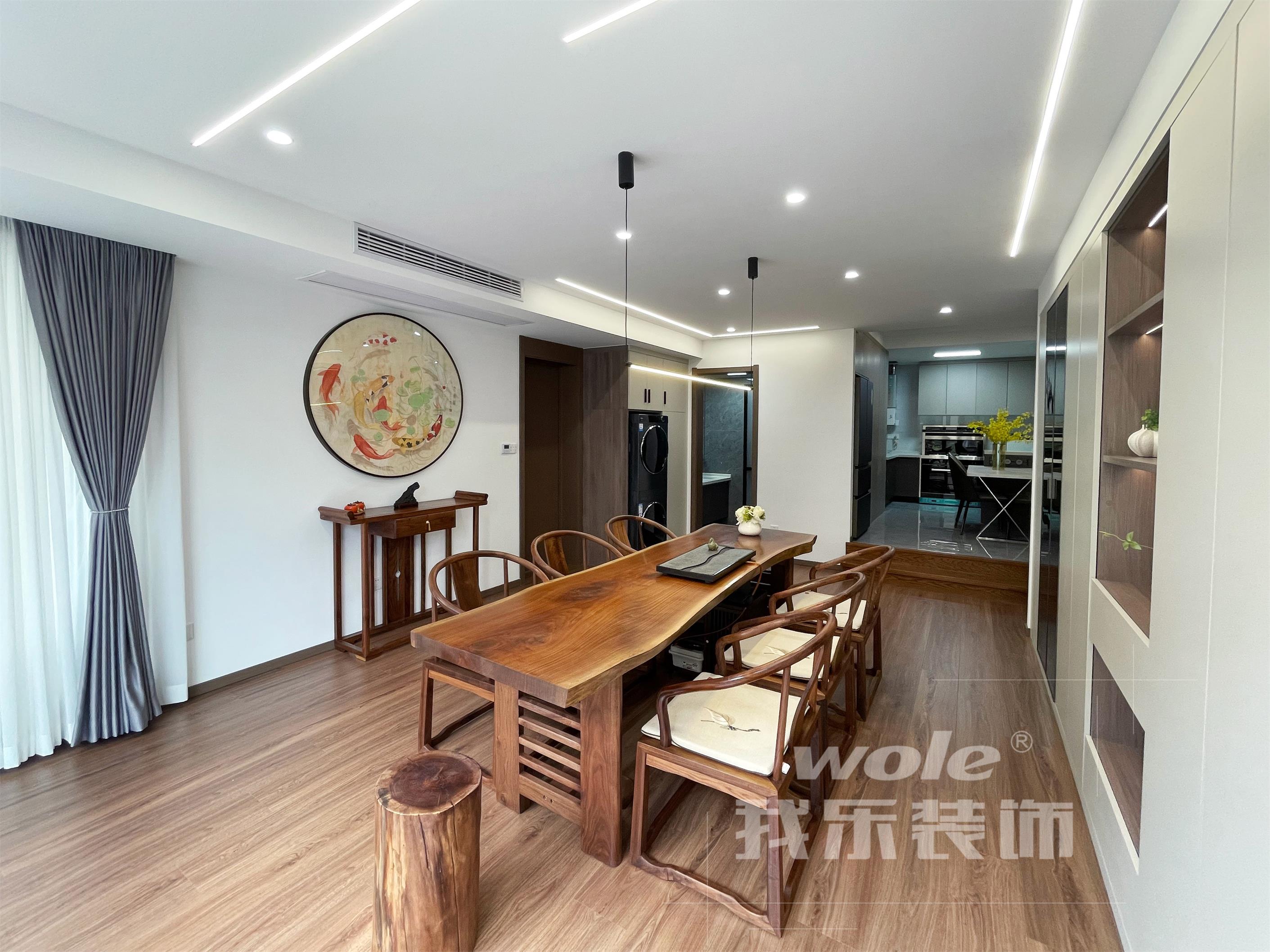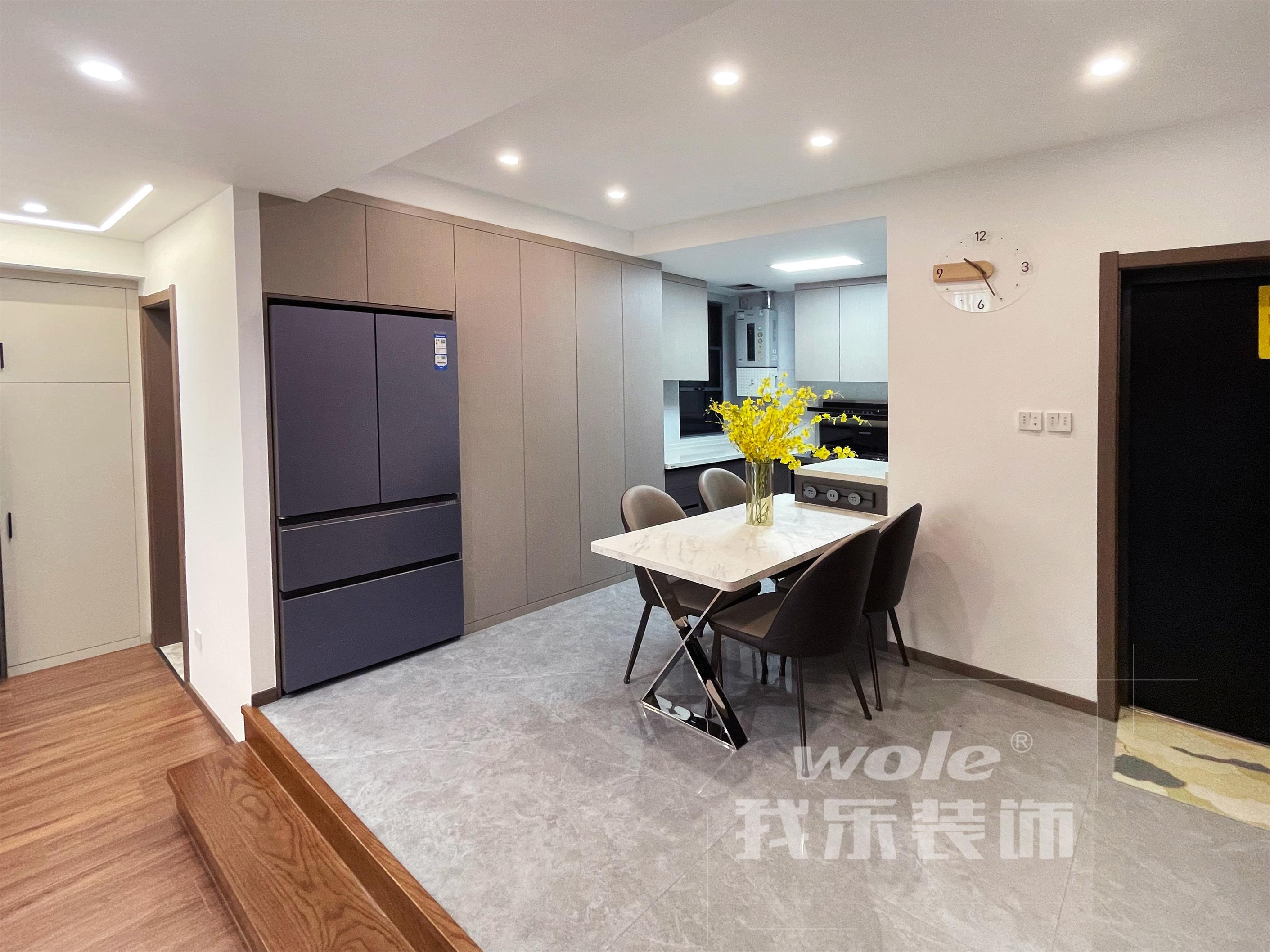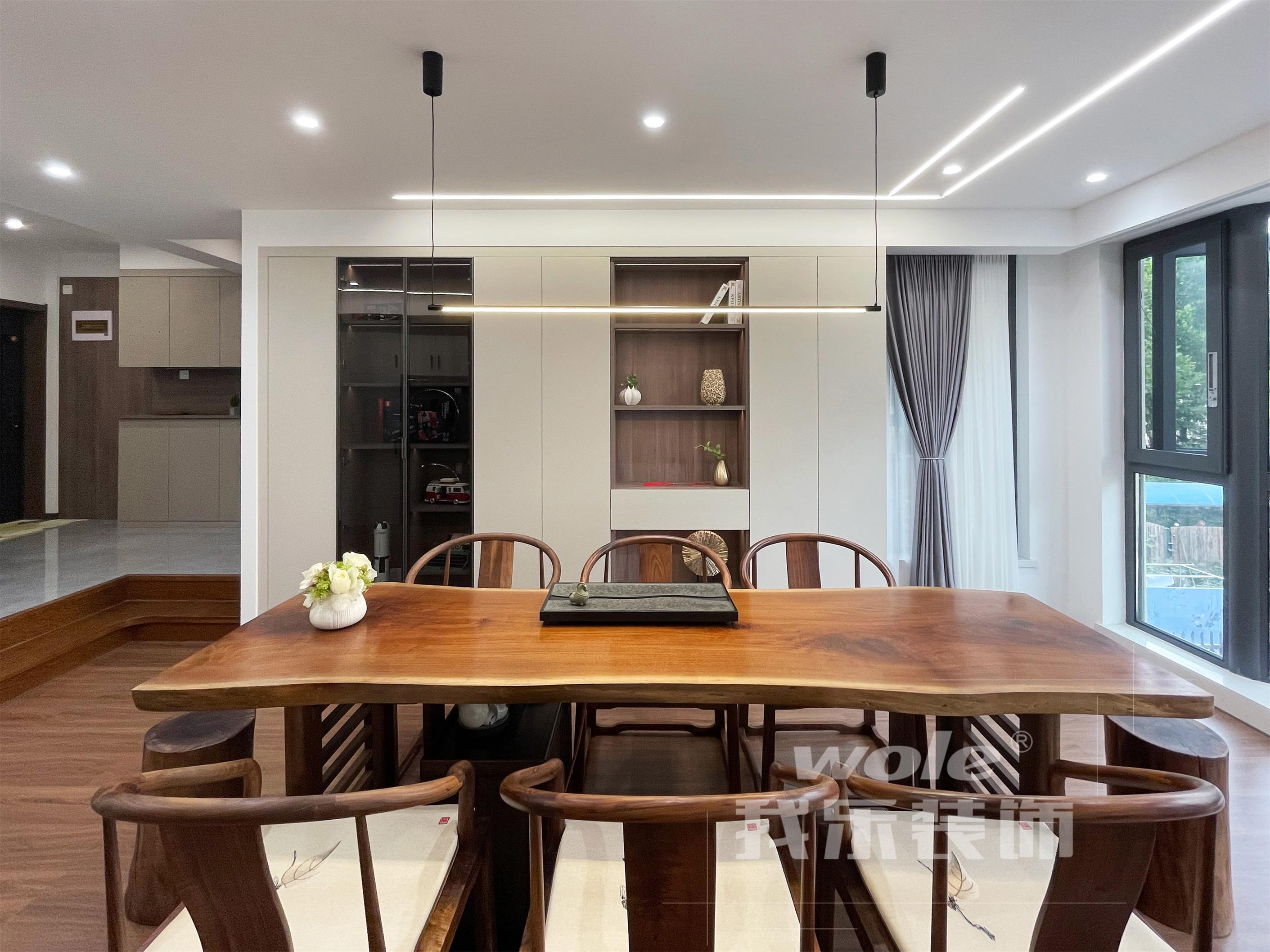 灰色柜子、木地板、長(zhǎng)方形木桌椅、紅木條案,材質(zhì)的藝術(shù)碰撞,既現(xiàn)代又傳統(tǒng),置身其中,構(gòu)建獨(dú)屬自我的悠然環(huán)境。