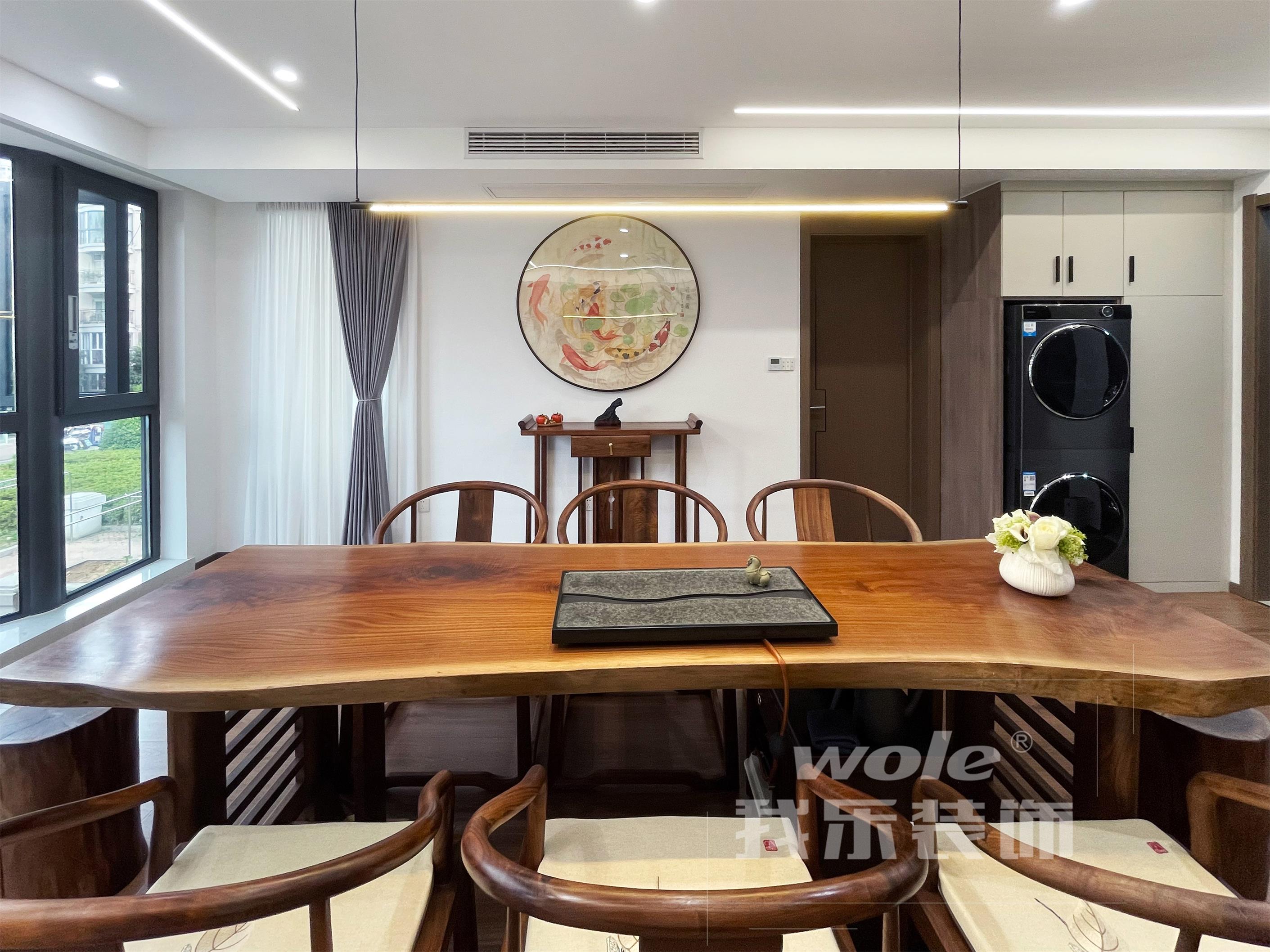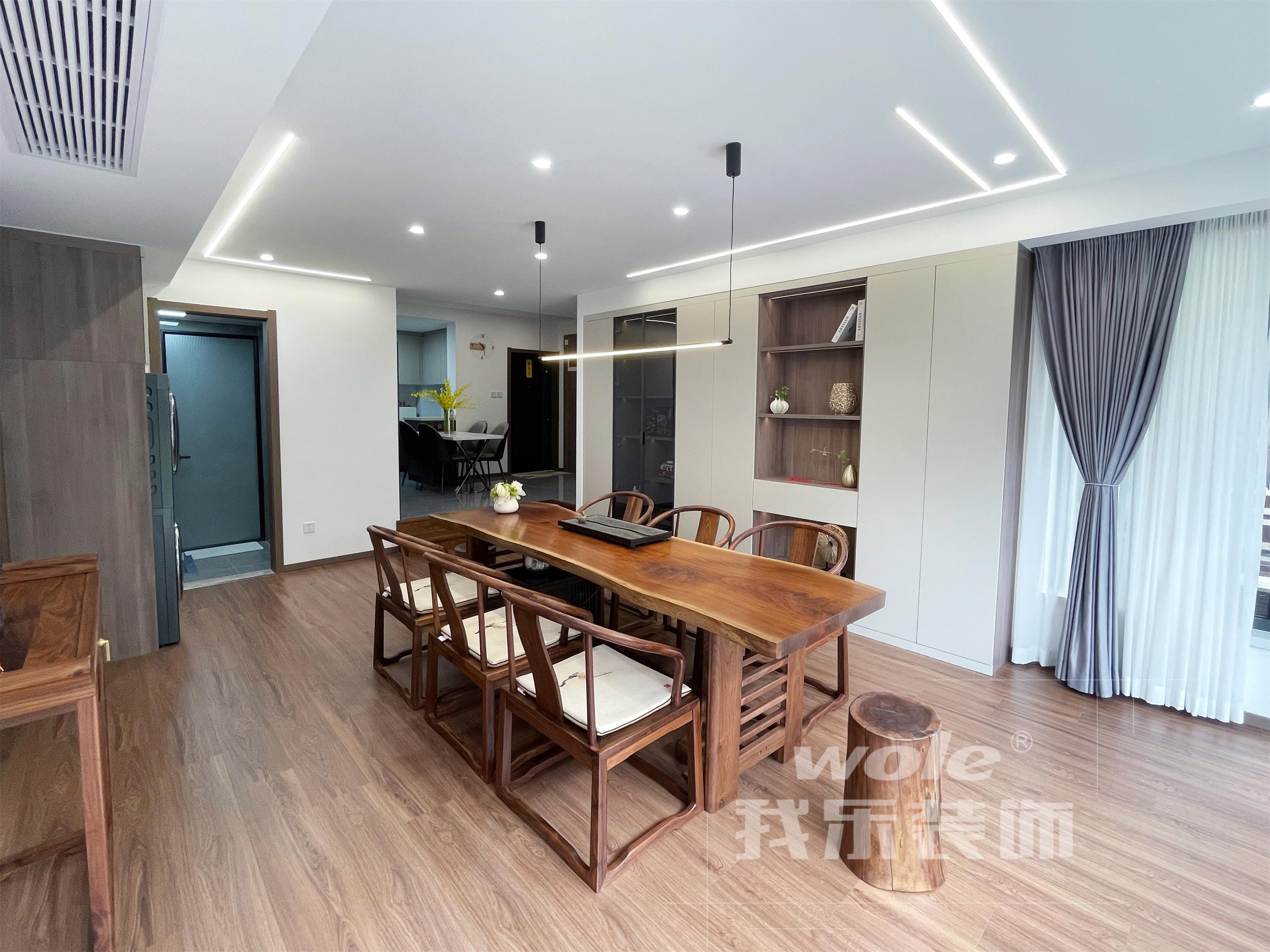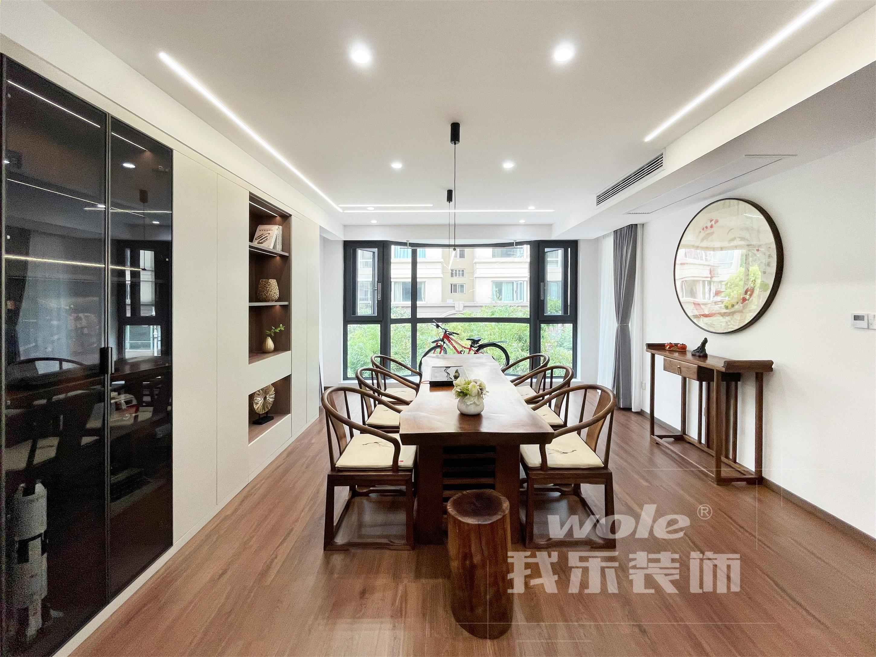 灰色柜子、木地板、長(zhǎng)方形木桌椅、紅木條案,材質(zhì)的藝術(shù)碰撞,既現(xiàn)代又傳統(tǒng),置身其中,構(gòu)建獨(dú)屬自我的悠然環(huán)境。