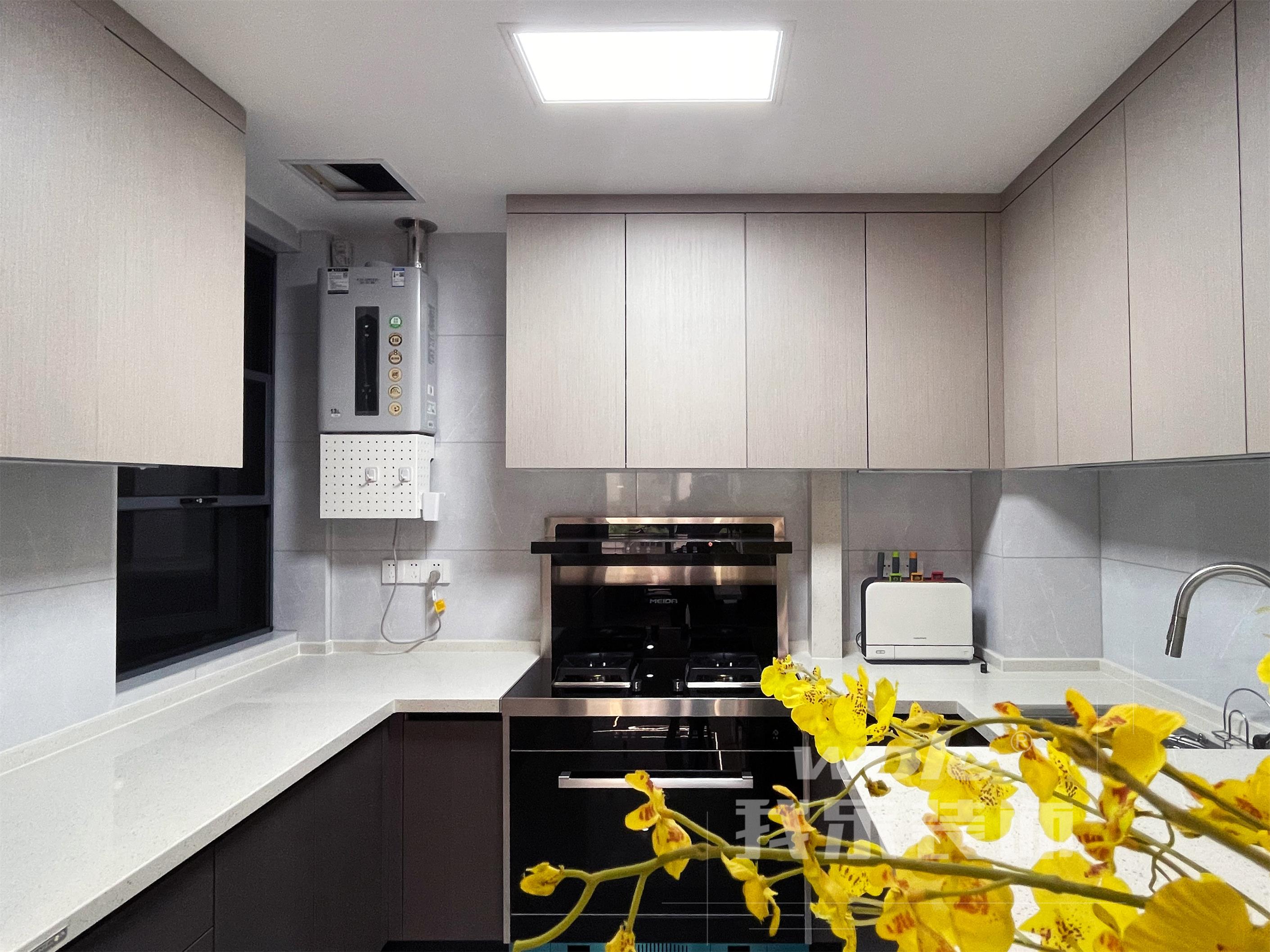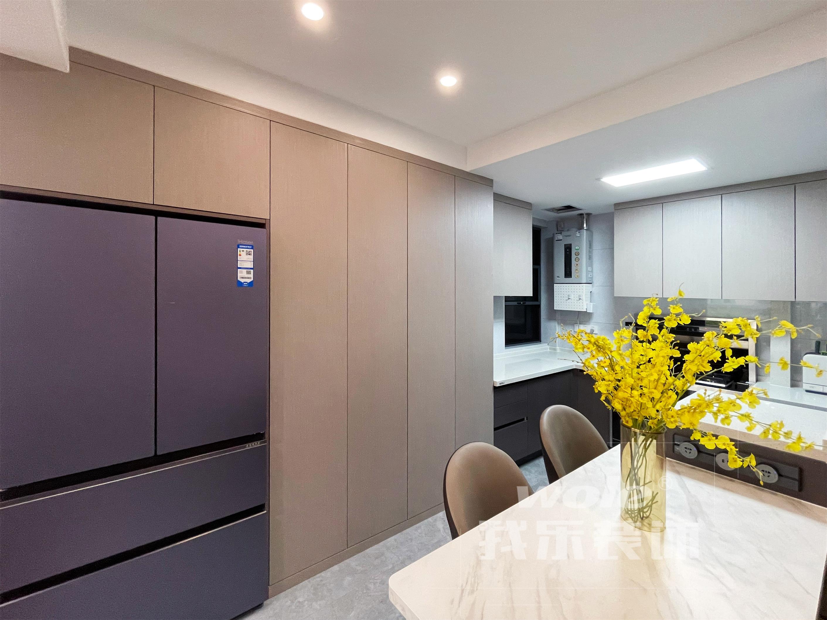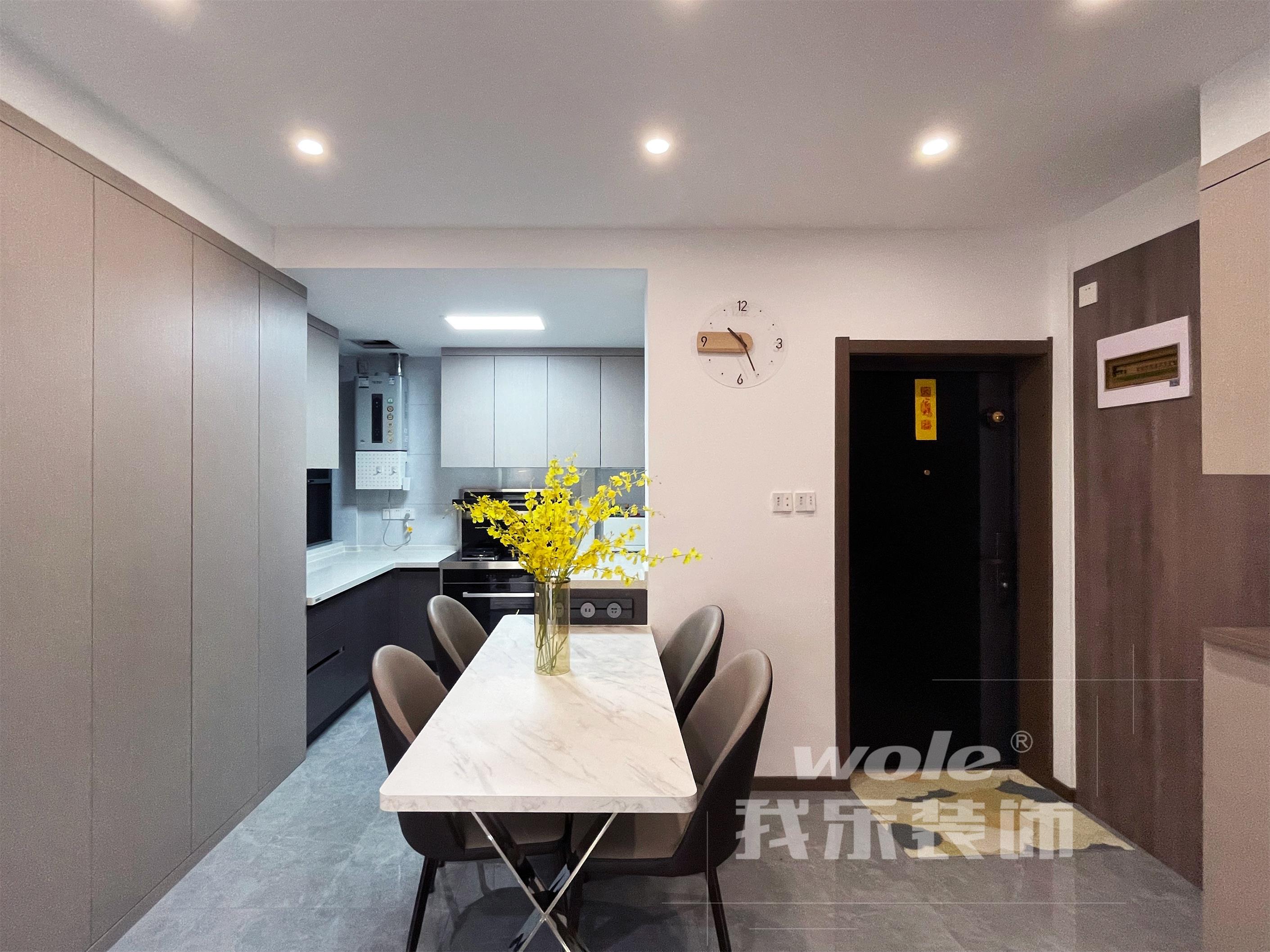 大理石臺(tái)面,深色柜子與桌椅,上白下深,高貴色澤,相互呼應(yīng),經(jīng)久耐看。