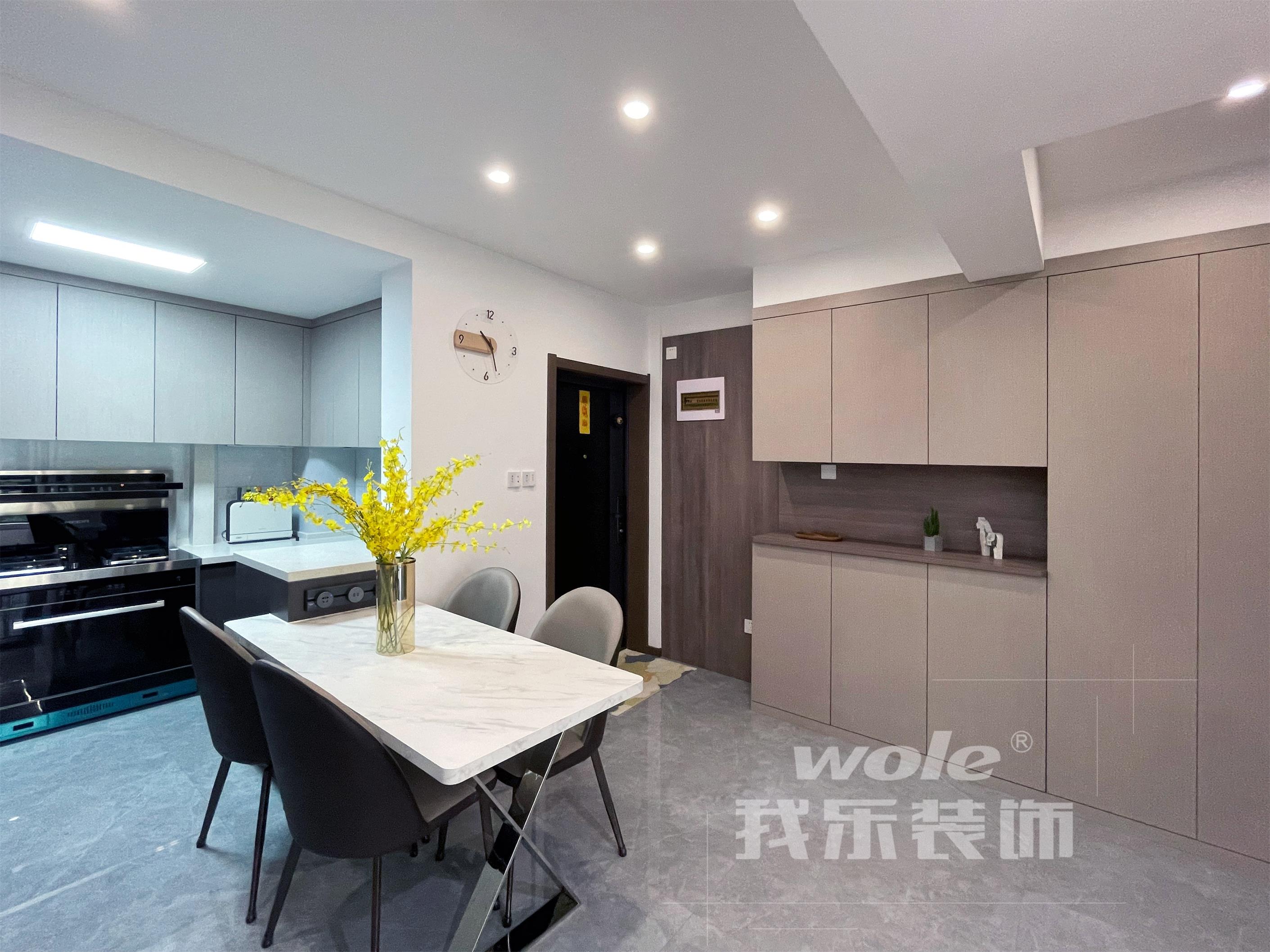 廚房的墻體打通,用導(dǎo)臺(tái)鏈接餐桌,橫向分割比例,功能二合一,產(chǎn)生了奇妙的延伸感。