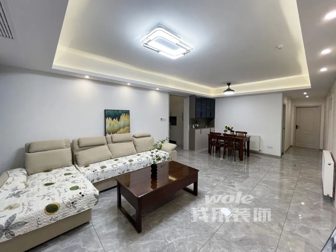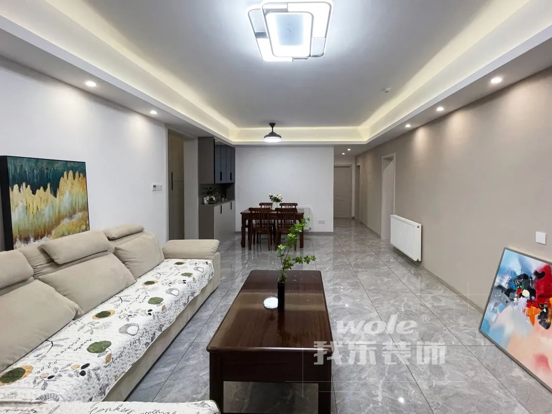 整個(gè)客餐廳以米色背景墻為主基調(diào),全為墻布鋪貼;吊頂用線燈鋪邊,讓現(xiàn)代簡(jiǎn)約風(fēng)格顏值爆表;60X120長(zhǎng)形通鋪,高檔又耐看;軟裝部分使用米色布藝沙發(fā)加上實(shí)木茶幾,讓整個(gè)空間更顯高級(jí)感。