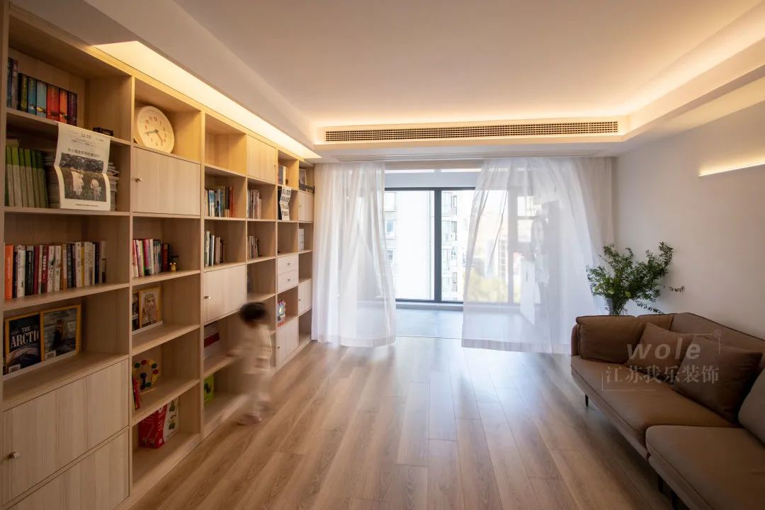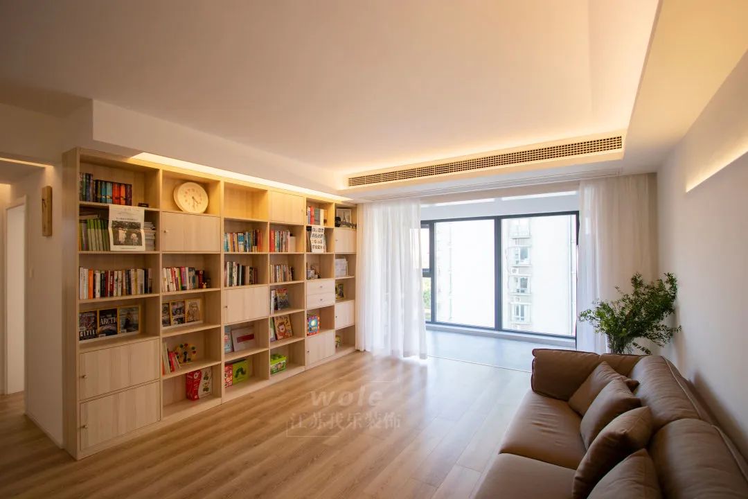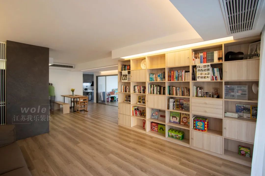 電視墻變成了家庭圖書(shū)館,開(kāi)放格與流云門(mén)板相結(jié)合,可以藏書(shū),可以手工臺(tái)擺放手作,也可以滿足收納需求,實(shí)現(xiàn)一廳多用的功能,突出實(shí)用感與藝術(shù)感。