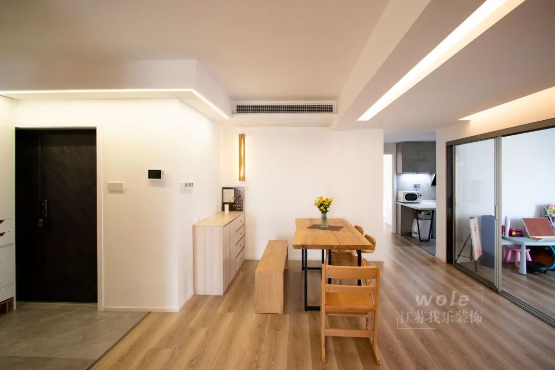 客餐廳一體,全屋地板通鋪,讓空間顯大不止一點(diǎn)點(diǎn)。餐邊柜上一束特色墻燈,打破了餐廳單調(diào)的氛圍。