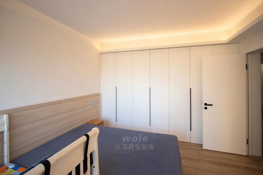 主臥床頭半墻的木飾面,簡(jiǎn)單自然,大大提升空間的質(zhì)感,無(wú)主燈設(shè)計(jì),燈光僅靠吊頂上的暖黃色調(diào)燈帶,讓空間顯得更加高級(jí)大氣,氛圍拉滿。