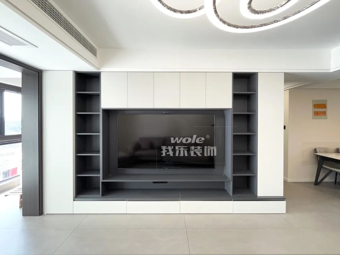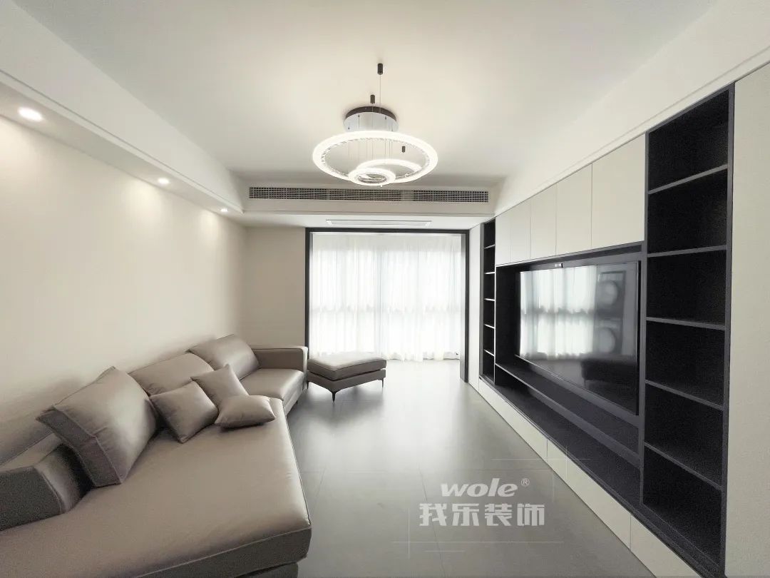 客廳以白色為主打色,以黑色輔助,硬裝+櫥柜+沙發(fā)+燈具,簡約之中溫馨有余。陽臺門拆除后擴大了客戶及陽臺的功能,大大提高了空間的利用率。