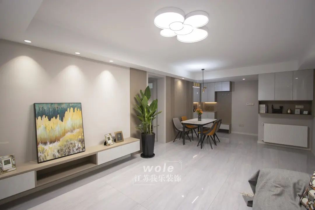 客廳沒有做復(fù)雜的電視背景墻,射燈打出來的光像小山丘一樣讓背景墻更加光彩奪目,也更加吸引人眼球!下方是懸空電視柜,給掃地機(jī)器人流出空間。