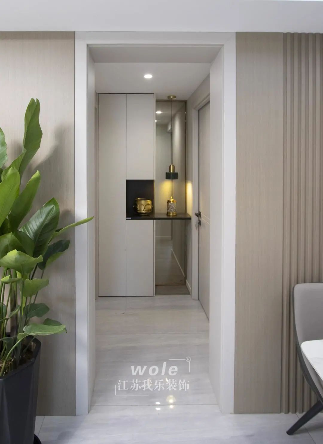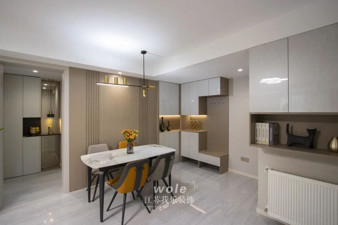 通往臥室的通道也很有儀式感,將原本光禿禿的一面墻一分為二,一半是收納區(qū),一半做了藝術(shù)燈設(shè)計(jì),讓空間更靈動(dòng)。