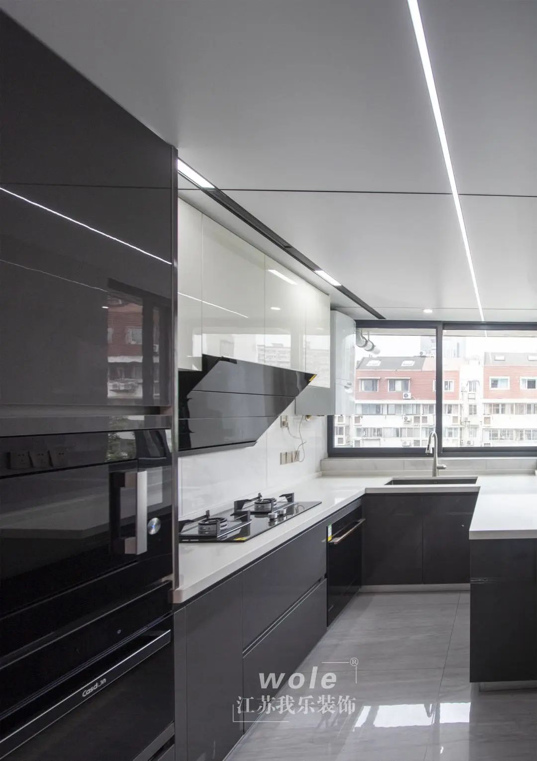 U型廚房設(shè)計(jì),烹飪區(qū)、清洗區(qū)、操作區(qū)界限分明。白色的墻面與深色的柜體搭配,簡約大氣還不過時(shí)。消毒柜,烘焙機(jī)做了嵌入式整體設(shè)計(jì),美觀又實(shí)用。