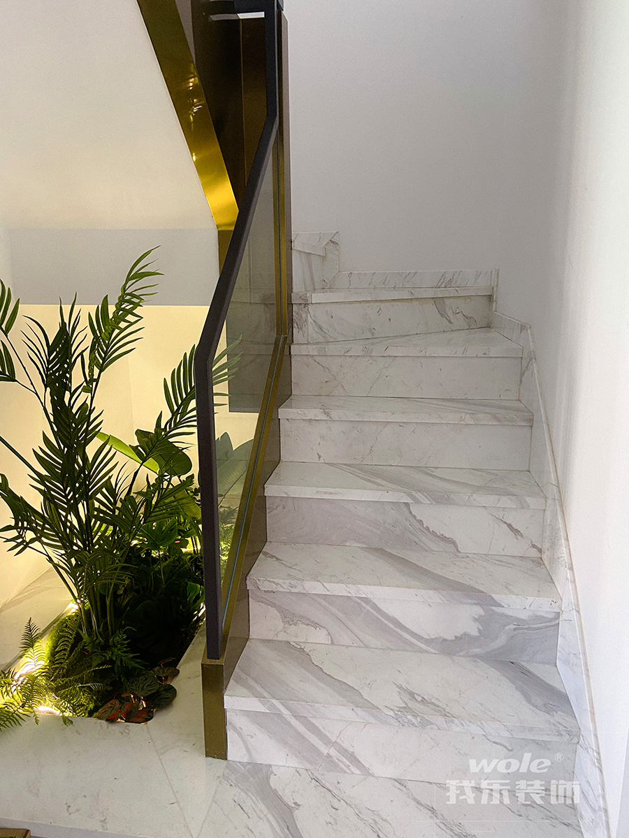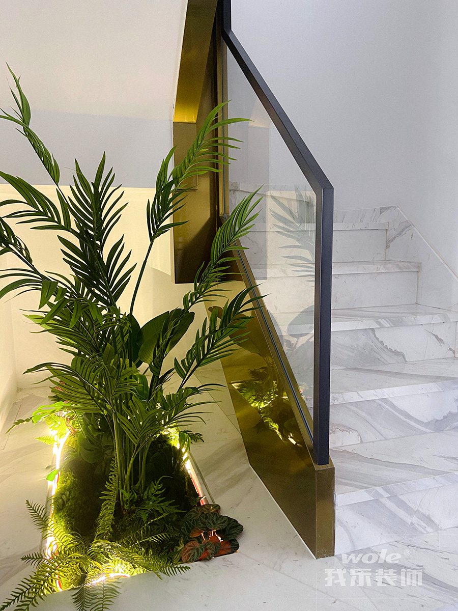 樓梯轉(zhuǎn)角打造自然景觀,幾抹綠植,配上沙石、打上燈帶,室內(nèi)小花園就有了。裝點空間,生機(jī)盎然。