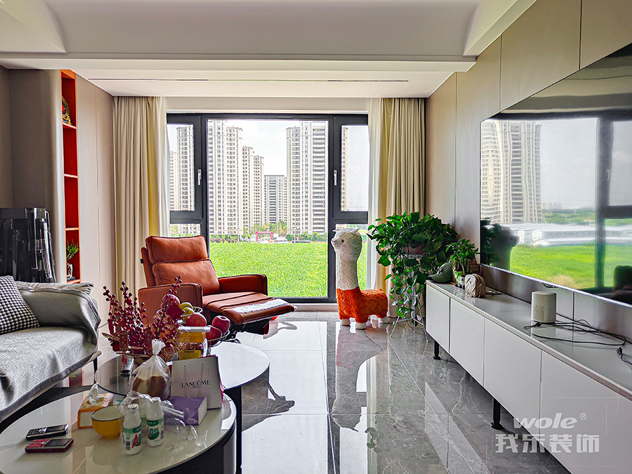現(xiàn)代輕奢風(fēng)兼具顏值與質(zhì)感的細(xì)膩,在色彩運(yùn)用上,以經(jīng)典黑白灰為基調(diào),搭配奶咖色的木飾墻面,用愛馬仕橙做跳色。整個空間氣質(zhì)溫馨,典雅精致。