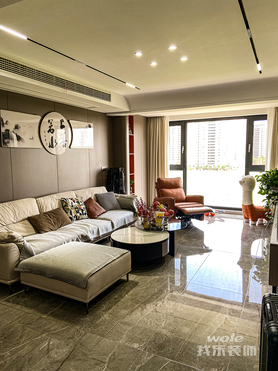 客廳無主燈設(shè)計,一組線型燈搭配射燈發(fā)出的光更均勻。簡約的雙眼皮吊頂,最大限度保留層高,讓空間更寬敞不壓抑。電視墻和沙發(fā)墻都選用了奶咖色的木飾面,電視墻的一側(cè)還有通向次臥的隱形門設(shè)計,整體和諧統(tǒng)一。米色L型皮質(zhì)沙發(fā)配橙色單椅,美觀舒適。