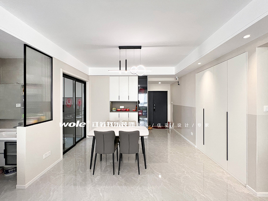 1、將廚房門向里收縮,使其和沙發(fā)背景墻處在同一平面。增加餐廳面積,讓客餐廳融合在一起。